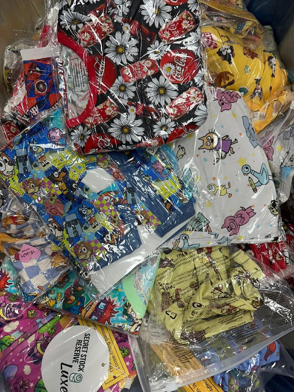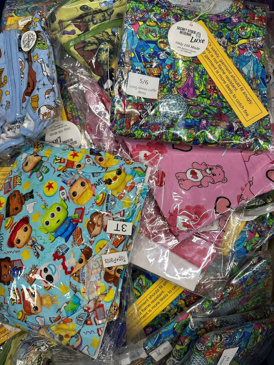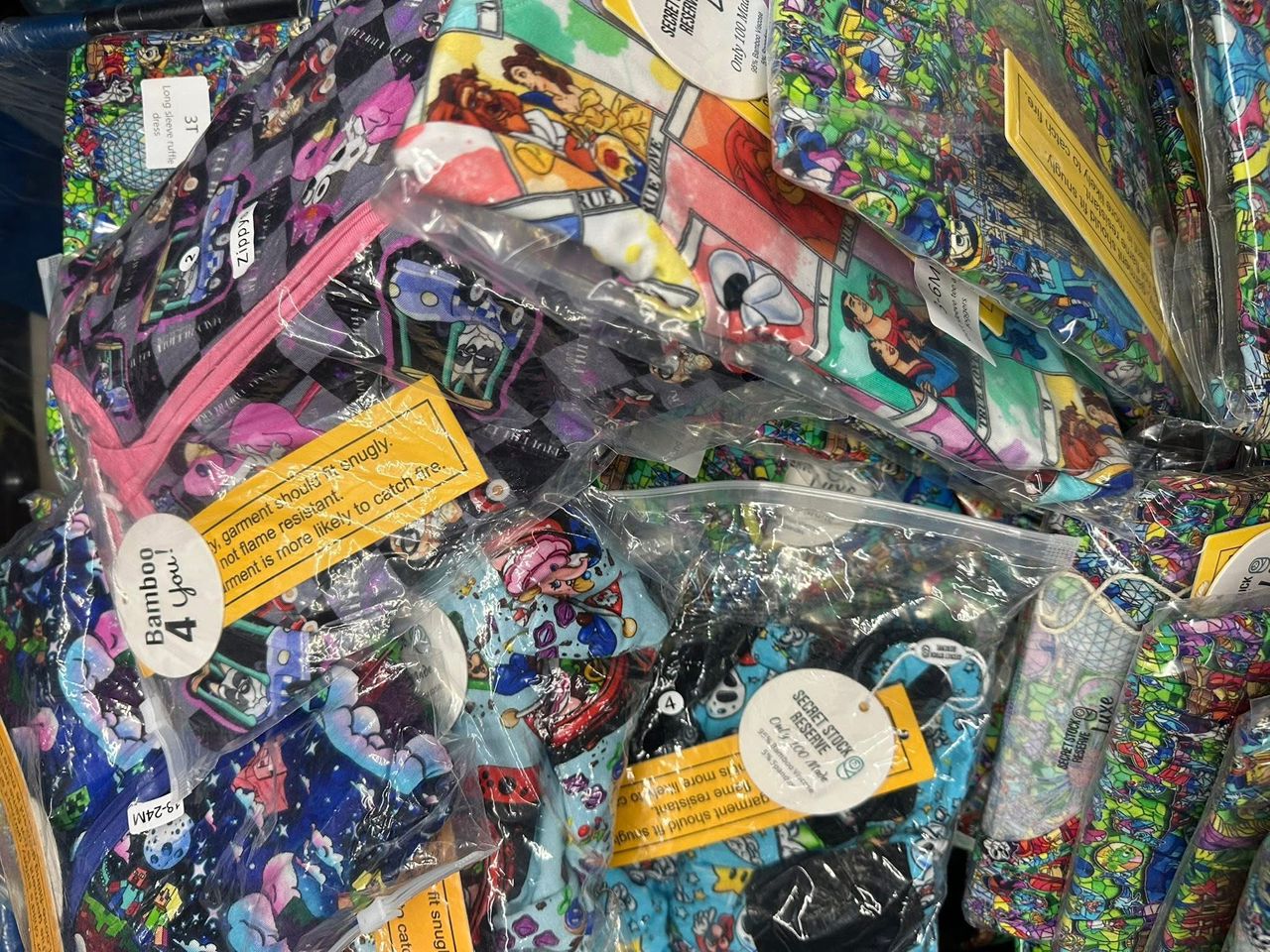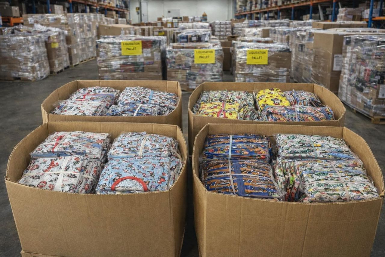 Some pallets have just baby clothes. Bundles are packed from current in-stock prints. We walk the aisles and grab a mix — what we have is what we have. New prints arrive often, popular prints sell fast, and no two bundles are ever identical.
