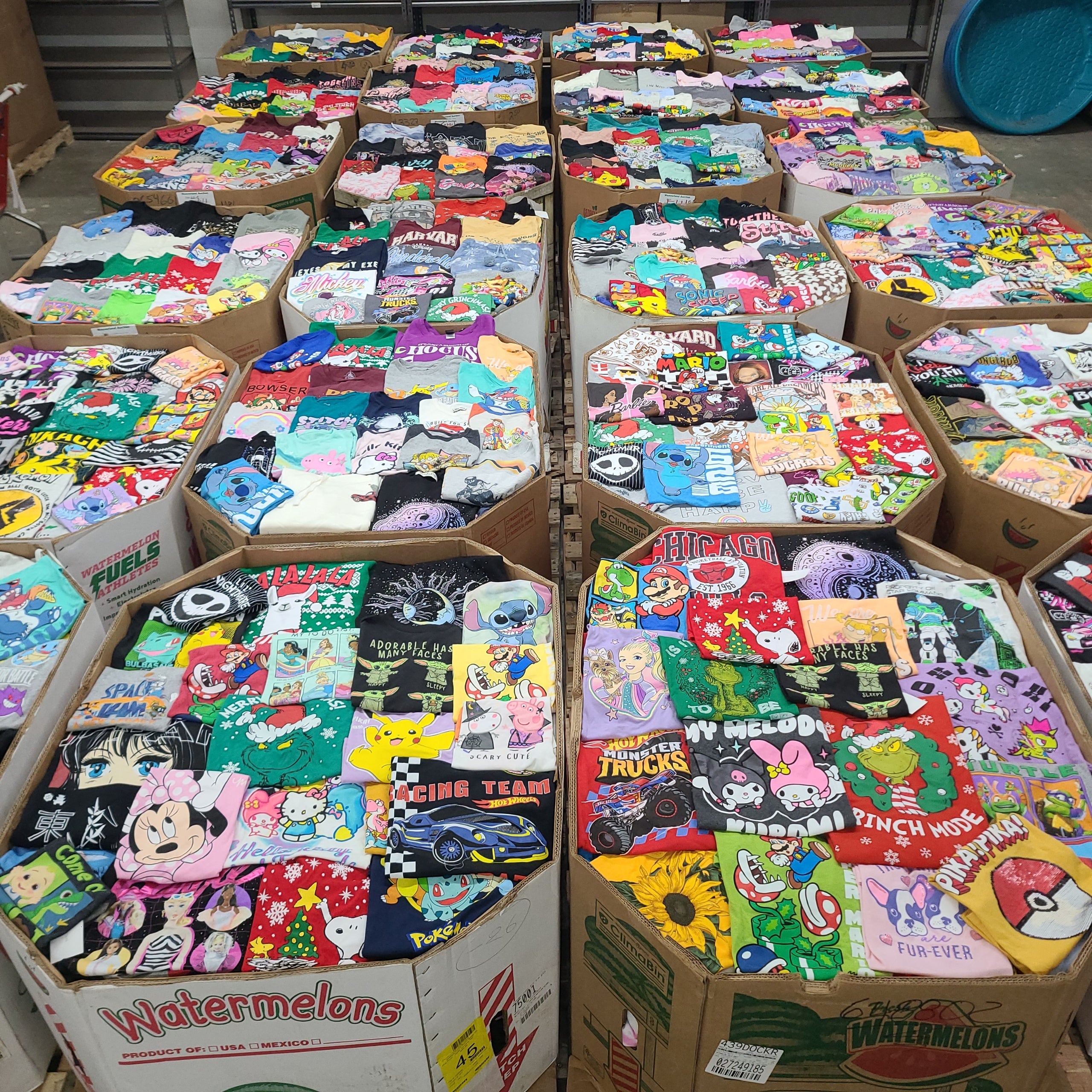 Bulk graphic tees and sweatshirtsIncludes licensed merchandise by Disney, Pixar, Pokemon, Super Mario, Hot Wheels, Barbie, sports teams, movies, tv shows, and more!Brand new with tags75% Kids 25 & AdultsMixed sizes and styles700 pieces$1850 per pallet